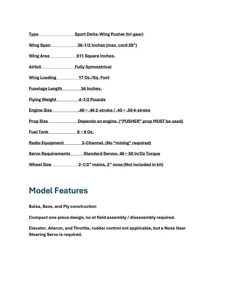 Wing Span 36-1/2 Inches (max. cord 29”)