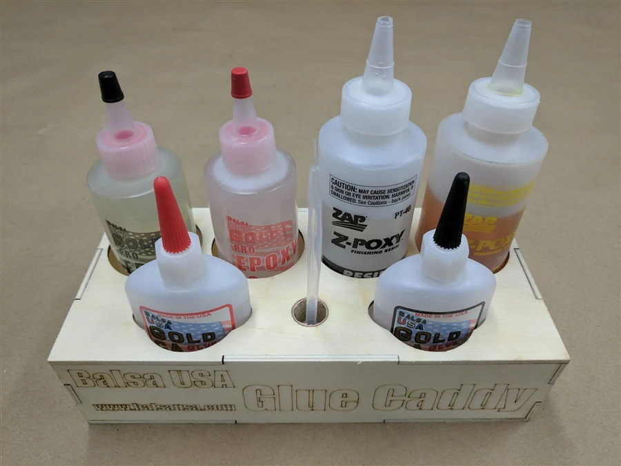 Balsa USA’s Large Glue Caddy is designed to hold two sets of epoxy, two bottles of CA, and one Pipette. It is 100% laser cut utilizing tabbed construction so everything lines up easily and quickly!