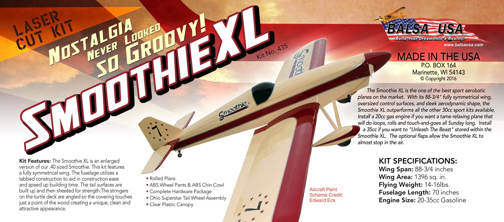 Install a 20cc gas engine if you want a tame relaxing plane that will do loops, rolls and touch-and-goes all Sunday long. Install a 35cc if you want to "Unleash The Beast" stored within the Smoothie XL. The optional flaps allow the Smoothie XL to almost stop in the air.