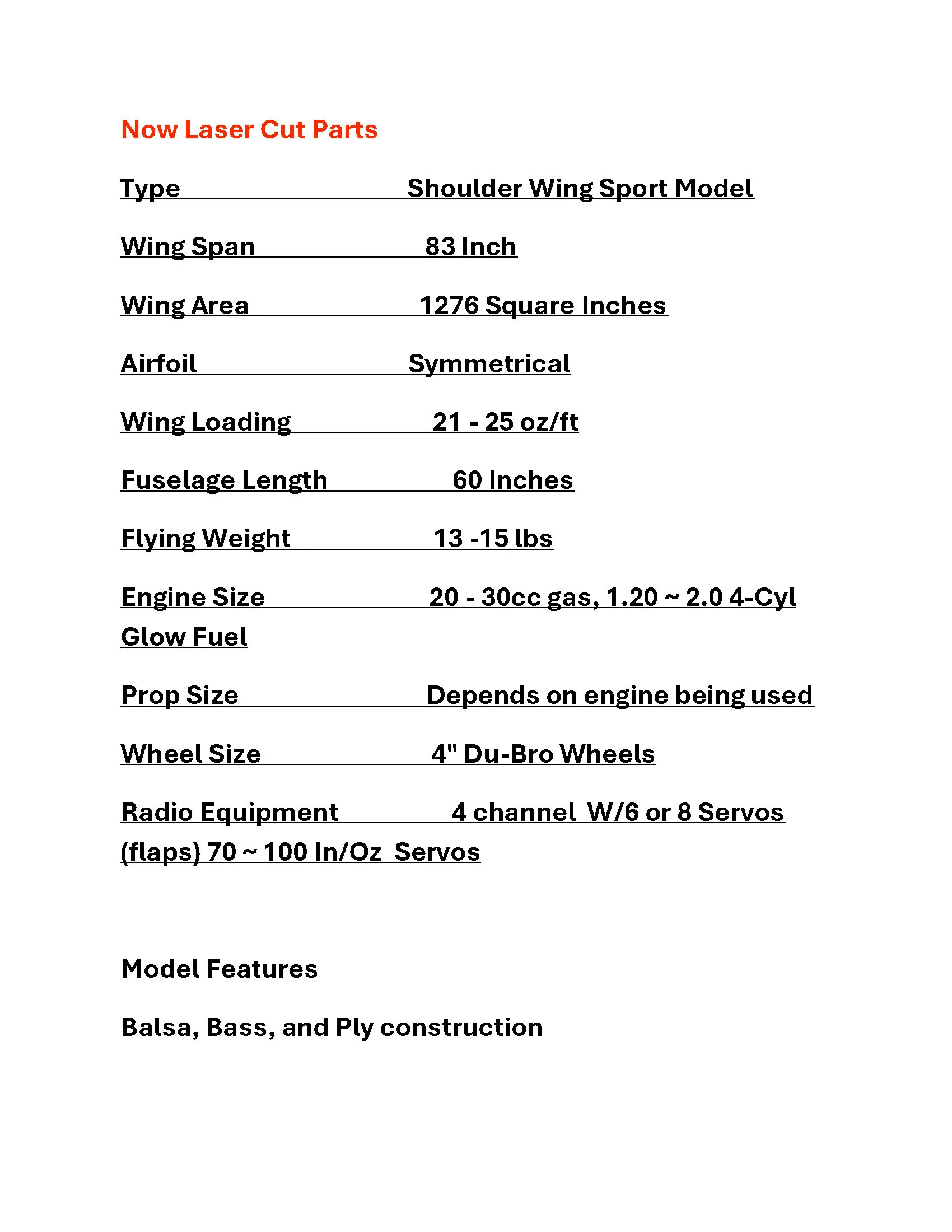 The Stingray is a perfect sport model for any day of the week. The highly efficient wing tip end plates and mid wing design make its flight performance nothing less than fantastic. Its quick and easy build design make it great for a modeler who is building his first kit or one who just wants a fun plane they can get in the air fast. The Stingray makes a great aerobatic trainer at a fraction of the cost of most aerobatic planes. With new updates to include options for flaps and tail mounted servos, installing a gas engine will help to keep fuel costs down. Its light weight creates a great platform for an electric conversion and also helps allow the Stingray to have superb low speed stability.
